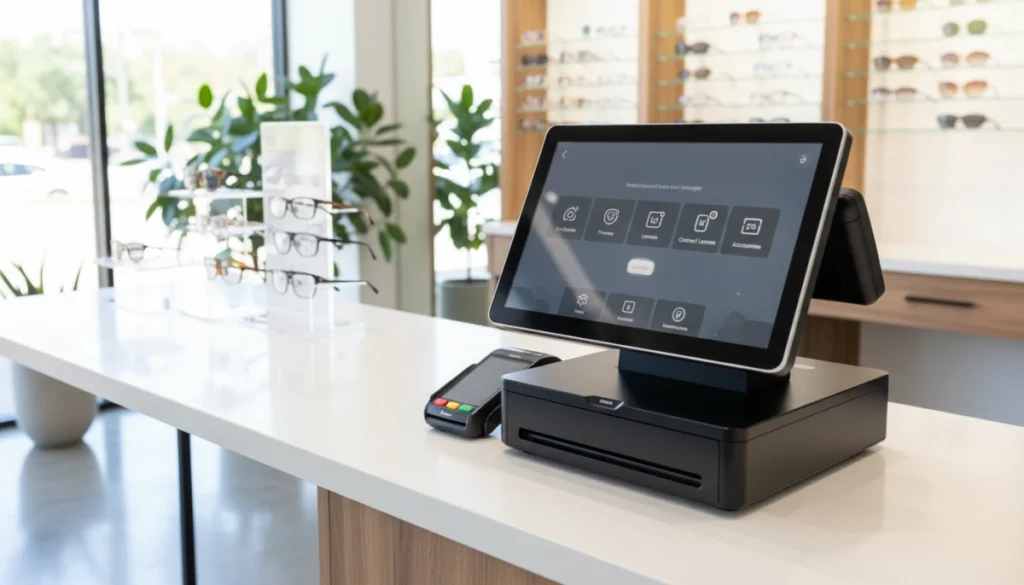 Industrial grade cash register POS terminal for optical stores with touchscreen barcode label printing and durable eyewear retail hardware